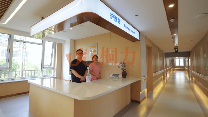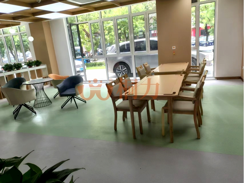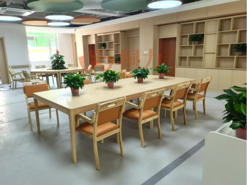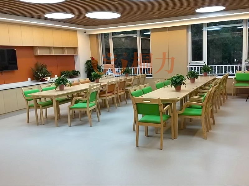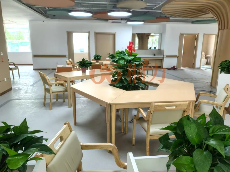 大廳:配置有服務台,台麵高度70-85厘(lí)米,輪椅老人也能輕鬆趴著辦手續,台麵下留空方便腿腳伸展。地麵鋪防滑材料(liào),下雨天也不怕(pà)打滑,有的適(shì)老桌還帶排水槽,水漬(zì)快(kuài)速流走;沙發兩邊(biān)有(yǒu)實木扶手,起身時能抓著借力,坐墊偏硬不(bú)塌陷,老人坐久了也不累。